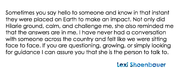 “Hilarie has an amazing way of intuitively knowing what you need. She is so supportive and holds a space of compassion and understanding. She helped me with something that took 20 plus years to say out loud. I couldn’t imagine feeling so great after bringing light to something like that, but because of hilarie, it felt wonderful and I was able to feel clarity. I would highly recommend her to anyone!” – M.R.