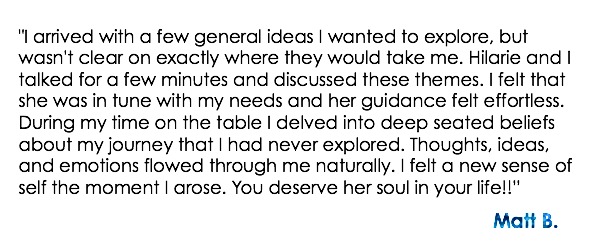 “This has to be my 5th (or so) session with Hilarie, and each time I leave feeling better than the last. With each appointment I understand energy and my energy better. I never realized how important this was to my overall health and life. I continue to reap the benefits of my time with Hilarie weeks later.” – T.P.